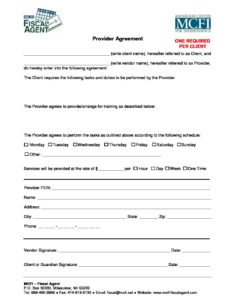 Provider Agreement. This form is used for the Provider to agree provide/arrange for training.
